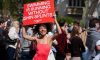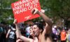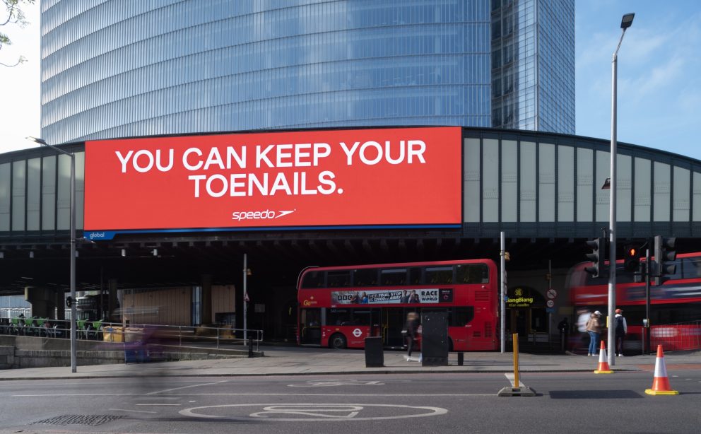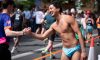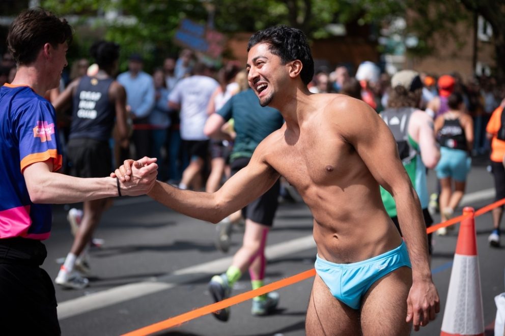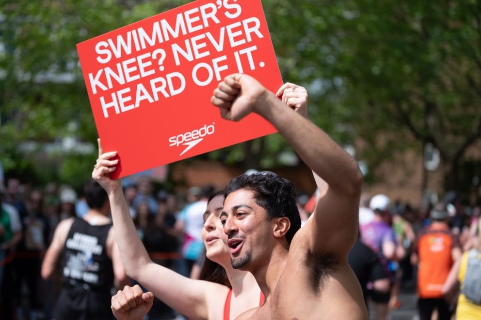 Team Speedo turn heads at the London Marathon route on Sunday, April 26, 2026, holding placards that champion swimming as the "less painful" alternative to long-distance running. (Michael Knief/AP Content Services for Speedo)